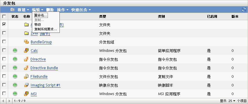 在“分发包”页上使用下拉列表可编辑现有的对象。要访问下拉列表,必须单击列表中对象名称旁边的复选框以选中对象。