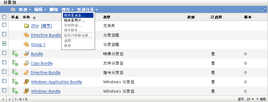 在列表中,选中一个或多个分发包组旁边的复选框。