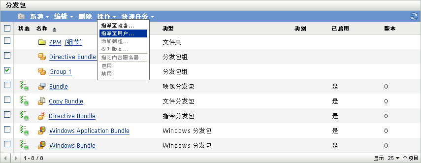 在列表中,选中一个或多个分发包组旁边的复选框。