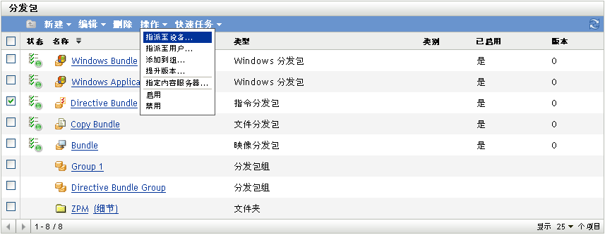 您可以使用“ZENworks 控制中心”或 zman 命令行实用程序来指派分发包。以下过程说明如何使用“ZENworks 控制中心”指派分发包。如果您更喜欢使用 zman 命令行实用程序,请参见“ZENworks 命令行实用程序”中的“分发包命令”。