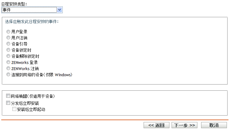 注:设备启动时,ZENworks® Adaptive Agent 会根据设备的刷新日程安排连接 ZENworks 服务器,以刷新其分发包、策略、配置和注册信息。如果信息发生更改,则即使会有一个事件触发器发生,自适应代理也必须先刷新其信息,然后设备上才会显示更改。默认情况下,会在设备启动后的 300 到 360 秒之间执行设备随机刷新,每 12 个小时进行一次完整刷新。