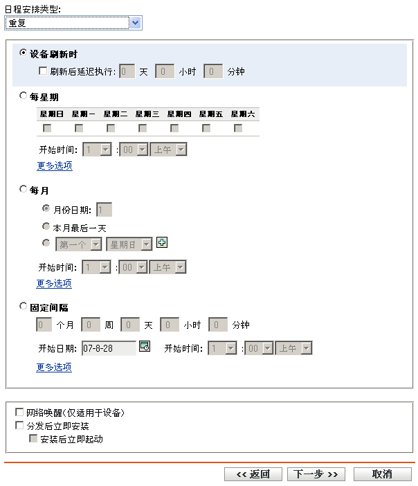 设备刷新时: 选择该日程安排会在每次 ZENworks Adaptive Agent 对设备执行刷新操作时,触发该事件。如果想要延迟事件,不让它在刷新时立即发生,可以选择选项,并指定事件延迟的天数、小时数或分钟数。