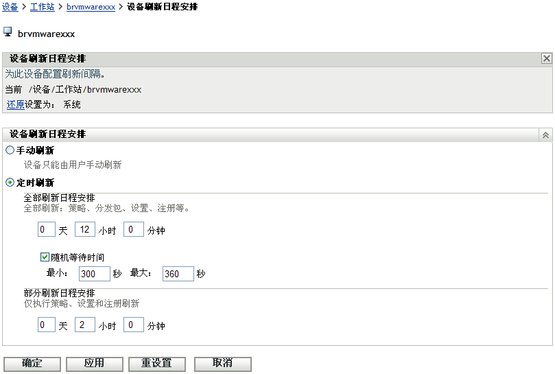 部分刷新日程安排: 定义想要设备从“ZENworks 服务器”更新其策略、配置设置和注册信息的频率。分发包信息不会更新。
