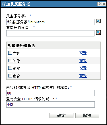 您可以创建新的从属设备或配置现有的从属设备,使其具有鉴定、内容、映像和集合角色,更改其默认端口以及调整角色的日程安排。您也可以去除现有从属设备的角色。