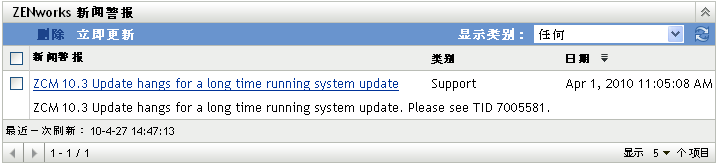 由“主服务器”下载的最新 ZENworks 新闻更新即会在“ZENworks 新闻警报”面板中显示。这可能要花一些时间。