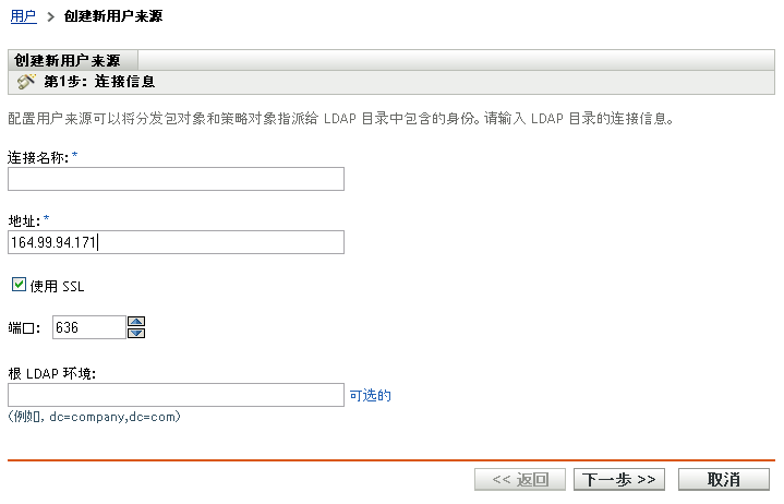 使用 SSL: 默认会启用此选项。如果 LDAP 服务器未使用 SSL(安全套接层)协议,则单击禁用此选项。
