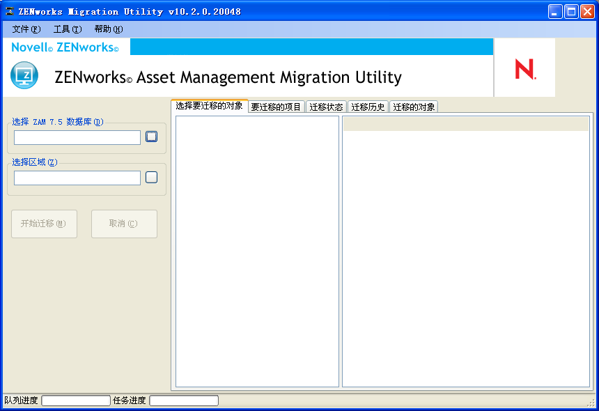 登录 Novell® ZENworks® 10 Asset Management 迁移实用程序后,即显示迁移控制台。