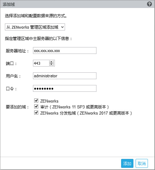 选择从 ZENworks 管理区域添加域,然后指定以下信息: