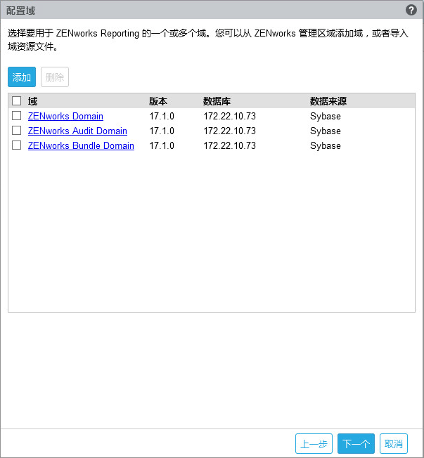 指定要用于 ZENworks Reporting 的一个或多个域。您可以从 ZENworks 管理区域添加域,也可以导入域资源文件。