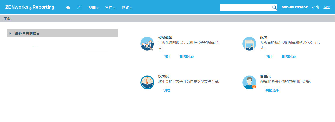 在内部,指定的用户 ID 将会鉴定到 LDAP 服务器。授权后,LDAP 服务器将允许您登录应用程序。ZENworks Reporting 主页随后即会显示。