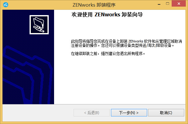 卸装 ZENworks 服务器并从区域中取消注册设备选项是唯一可用的选项。单击下一步确认操作。