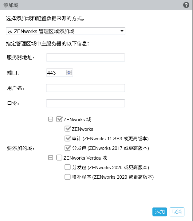 • 选择从 ZENworks 管理区域添加域,然后指定以下信息: