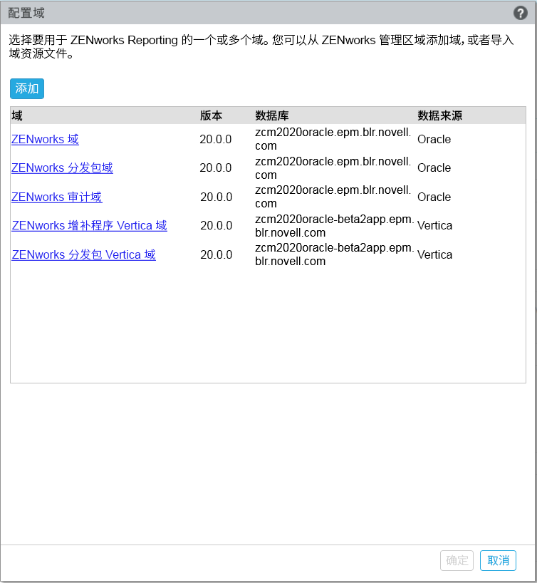 10. 指定要用于 ZENworks Reporting 的一个或多个域。您可以从 ZENworks 管理区域添加域,也可以导入域资源文件。