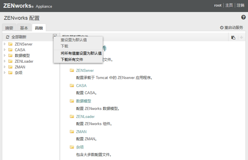 将所有值重设置为默认值: 将所有文件还原为自上次应用 ZENworks 系统更新后的状态。