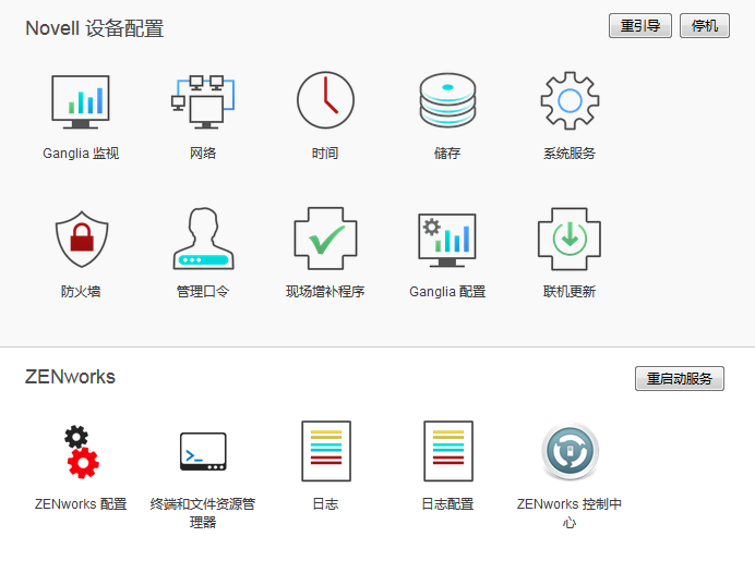 如果您以 root 或 zenadmin 用户身份登录,“ZENworks”部分会显示以下选项: