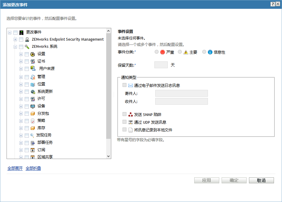 有关更改事件和代理事件类别的信息,请参见《ZENworks 11 SP4 Audit Management Reference》(ZENworks 11 SP4 审计管理参考手册)。