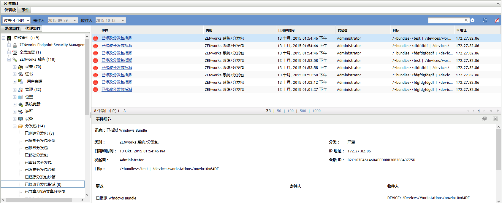 • 事件(审计日志): 使用此选项卡可以查看区域中发生的所有事件。显示的信息采用类似于“事件配置”页中的格式。系统会对所生成事件的类别显示一个计数。例如,如果生成了一个分发包指派管理事件,则树型结构中会对“分发包指派管理”类别显示 1。当您单击该事件时,右侧窗格中会显示该事件的细节。