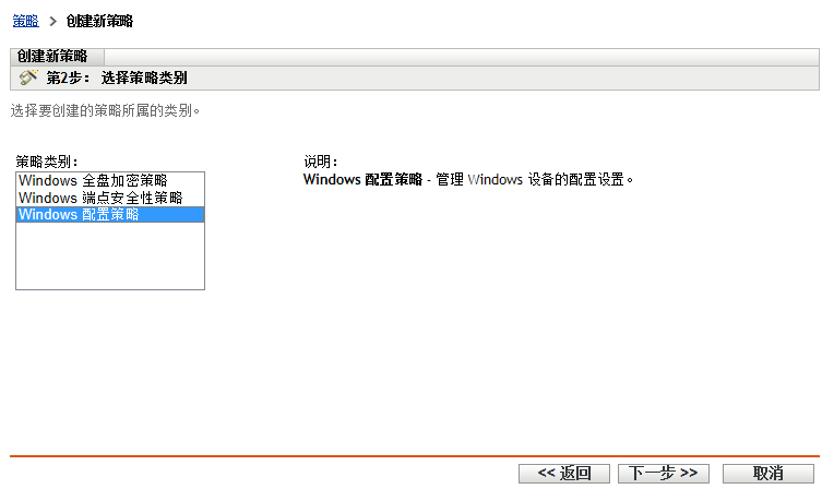 在“选择策略类别”页中,选择 Windows 全盘加密策略,然后单击下一步。