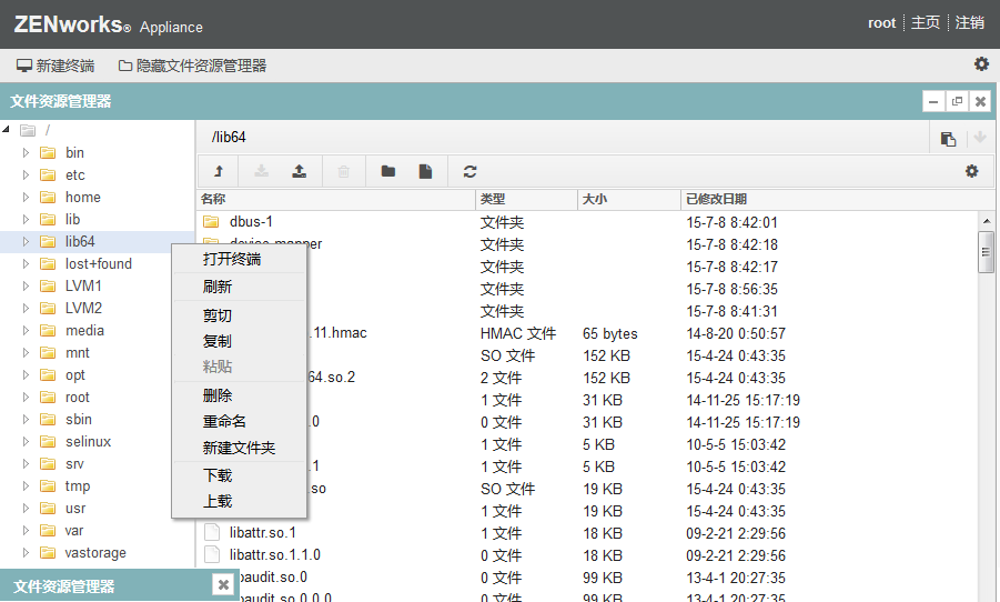 </theme>在 ZENworks Appliance 主页上的 ZENworks 部分,单击终端和文件资源管理器。