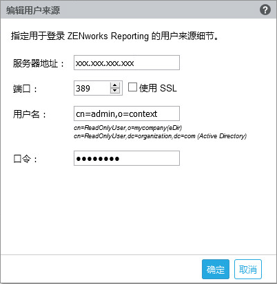 用户名: ZENworks Reporting 服务器需要具有对 LDAP 目录的只读权限,以便对每次登录尝试进行鉴定。此用户的身份凭证用来获取只读权限。