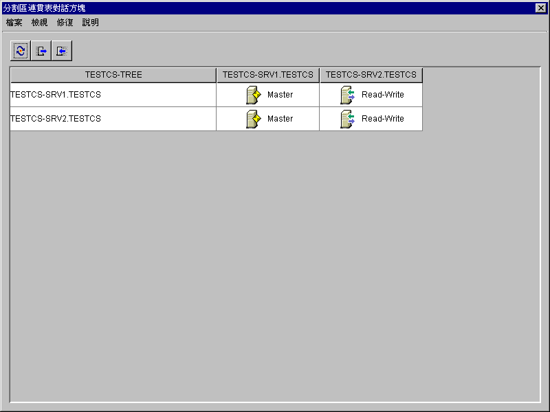 右窗格會顯示分割區在其上進行複製的伺服器清單,以及各複製本的類型與狀態。如需複製本類型的描述,請參閱《Novell eDirectory 管理手冊》 > 複製本。如需複製本狀態的描述,請參閱 關於複製本狀態。