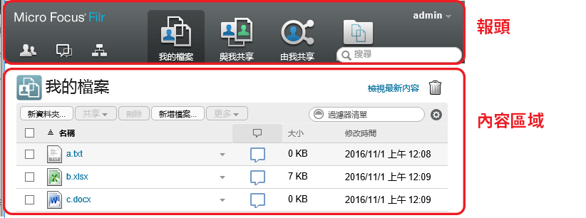 名稱連結: 在任一 Filr 頁面的右上角按一下連結名稱,以檢視下列選項: