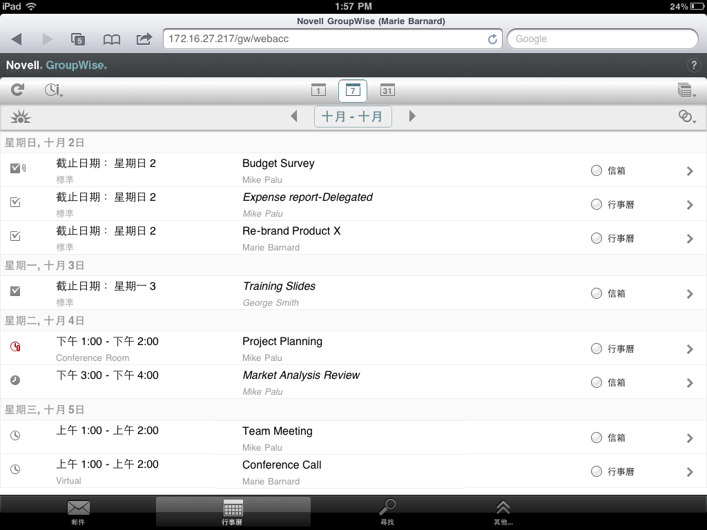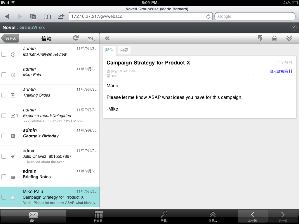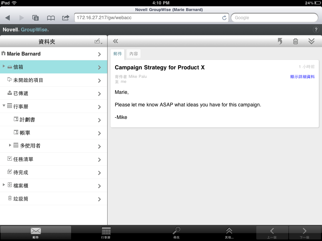 透過平板設備的網頁瀏覽器登入 GroupWise 後,顯示的是您的「信箱」。