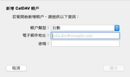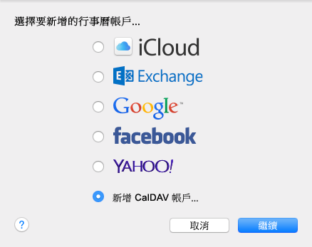 在 Mac 行事曆應用程式中,選取行事曆 > 新增帳戶。