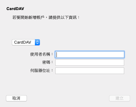 在 Mac 聯絡人應用程式中,選取聯絡人 > 新增帳戶。