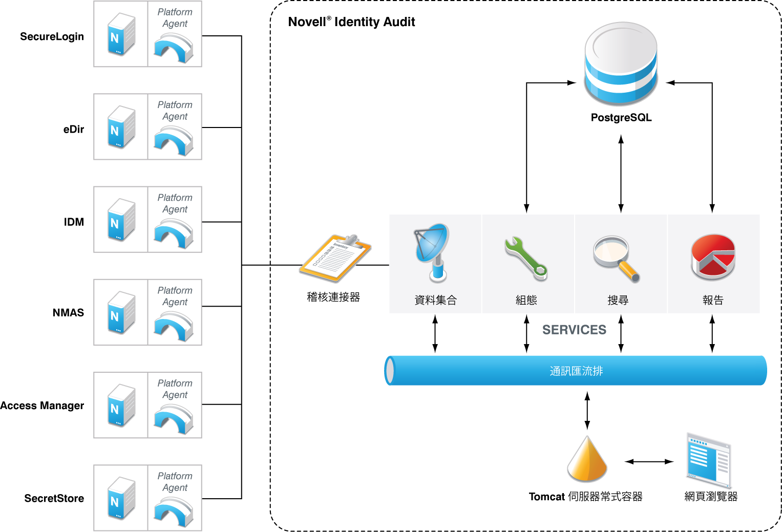 使用者可透過網頁瀏覽器 (連接至 Apache Tomcat Web 伺服器) 與 Identity Audit 伺服器及其所有功能互動。Web 伺服器會透過「通訊匯流排」呼叫各 Identity Audit 元件。