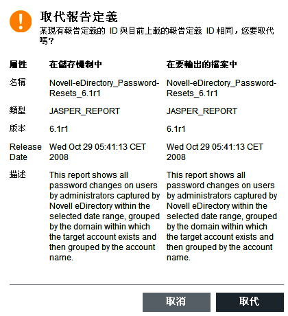 使用者可以上載更新的報告至 Identity Audit 以取代現有的報告。如需詳細資訊,請參閱節 5.4.1, 新增報告。