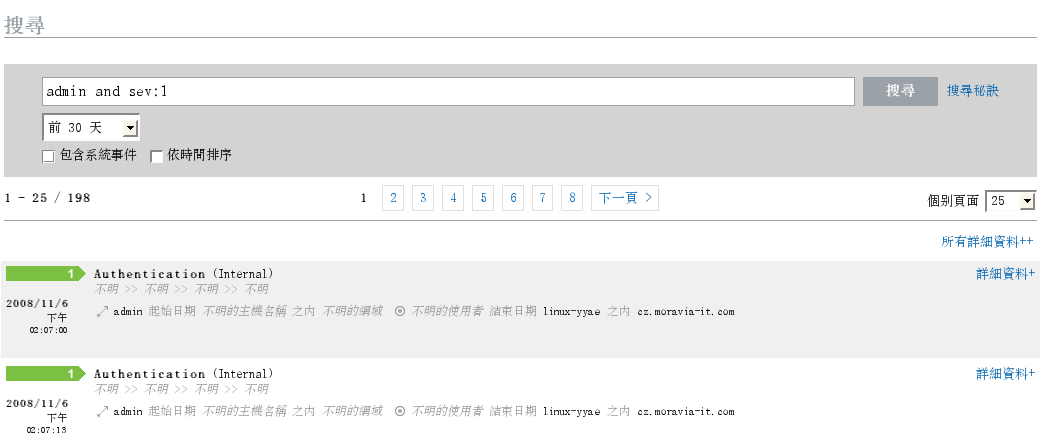 附註:若使用者機器與 Identity Audit 伺服器機器的時間並未同步 (例如,一部機器的時間比正確時間快 25 分鐘),搜尋時可能會傳回未預期的結果。「」或「」等搜尋是以使用者機器的時間為準。