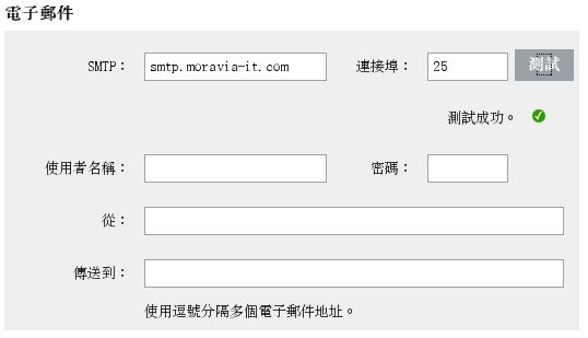 在「」下,輸入可用之 SMTP 傳送的名稱與連接埠。您可以點選「」來測試連線。