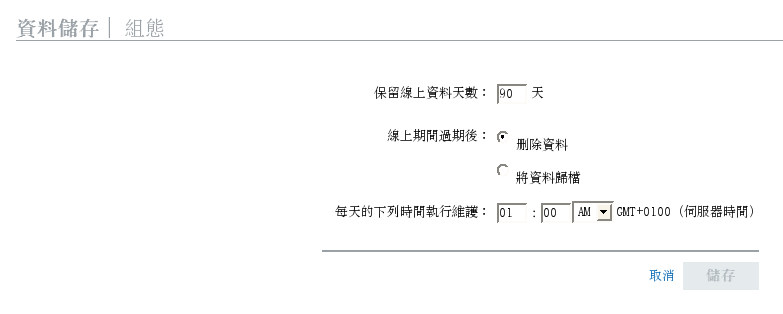 保留線上資料天數: 管理員可指定要在資料庫中保留報告用途資料的天數。最小值是一天,而且您只能指定整數 (不能指定含小數點的數字)。