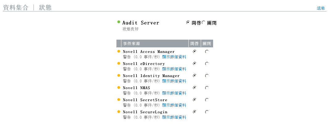 警告: 黃色指示器表示發生警告狀況。常見原因是應用程式已在 Identity Audit 開啟,但並未傳送任何資料。例如,若未正確地組態事件來源上的 Platform Agent 以傳送資料到 Identity Audit,或未針對應用程式啟用事件記錄功能,就會發生這種情況。點選「」,即可取得更多的資訊。