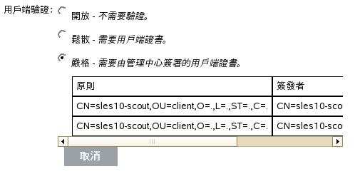 設定適當的用戶端驗證與伺服器金鑰組設定。如需詳細資訊,請參閱節 6.3.2, 用戶端驗證。