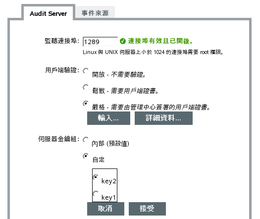 嚴格: 事件來源必須提供有效的 X.509 證書,而且該證書必須已由信任的證書管理中心簽署。若事件來源未提供有效的證書,Identity Audit 將不會接受其事件資料。