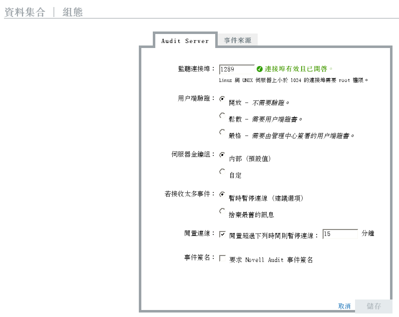 管理員可以變更一些關於 Identity Audit 如何監聽來自事件來源應用程式之資料的設定,包括 Identity Audit 監聽的連接埠,以及事件來源與 Identity Audit 之間的驗證類型。