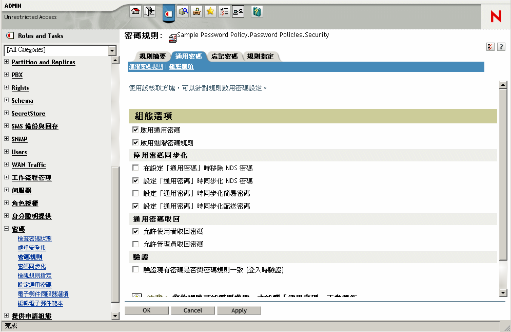 請記住,您必須確定被指定 NMAS 密碼規則的使用者與您要參與已連接系統之「密碼同步化」的使用者相符。