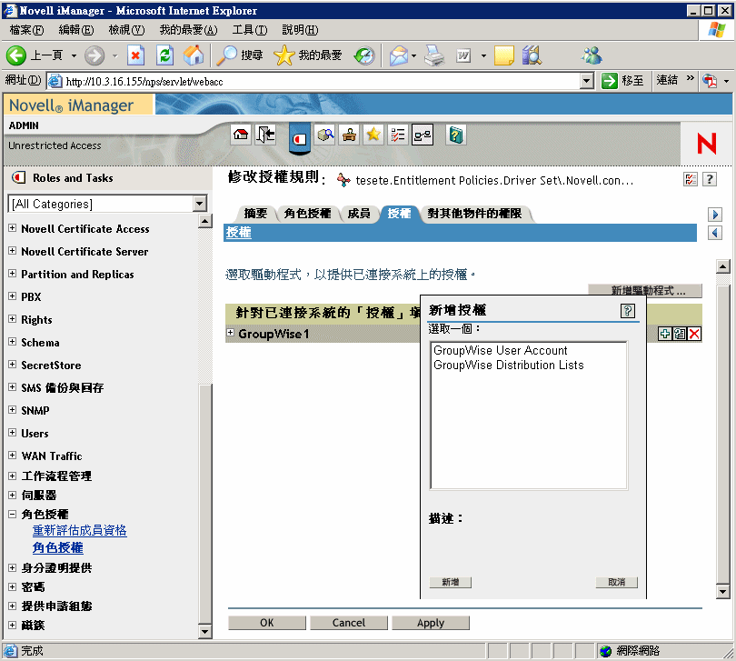 在步驟 4 中,選取 Identity Manager 驅動程式,並提供要包含的授權。 您已在節 6.4, 透過 iManager 以 XML 格式寫入授權中建立授權。 按一下「」,然後選取要新增的授權。