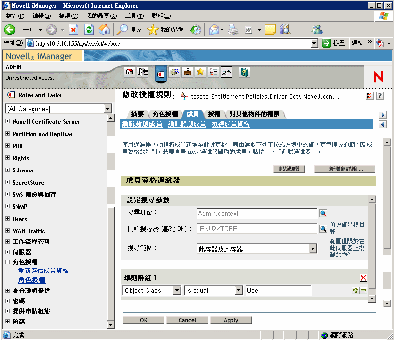 只有「使用者」物件 (及其他衍生自「使用者」類別的物件類型) 可以是「授權規則」的成員。 若要顯示「授權規則」的「成員資格」頁面,請選取「」,然後將「授權規則清單」中您要編輯的「授權規則」反白,並選取「」。在 Internet Explorer 瀏覽器中,選取「」索引標籤;在 Firefox 瀏覽器中,從下拉式功能表選取「編輯動態成員」。