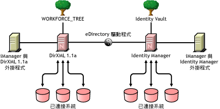 Identity Vault 包含要與其他已連接系統共享或同步化的使用者或物件資料。 建議您將 Identity Manager 安裝在其本身的 eDirectory™ 例項中,並將其做為您的 Identity Vault。