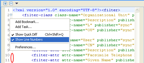 XML 編輯器會顯示行號。 若要查看行號,請以滑鼠右鍵按一下左邊界,然後選取「」。
