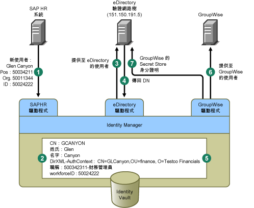 圖 4-1 所顯示的是一種典型卻又簡易的案例,其中涉及將「單一登入」身分證明提供給 GroupWise® 的新使用者。 此部門透過 SAP HR 系統和 Identity Manager,提供新使用者進入 Identity Vault。 視組織資訊而定,使用者接著會提供到 eDirectory 上實作的部門認證樹中。 這是使用者驗證網路的地方,也是 GroupWise 安全性身分證明的儲存機制;Novell iChain® 或 Access Manager® 會從公司防火牆外,使用該儲存機制提供安全「單一登入」功能。 在 Identity Manager 後續提供使用者給 GroupWise 的同時,那些系統的身分證明會同步化到驗證樹中的 SecretStore 屬性。