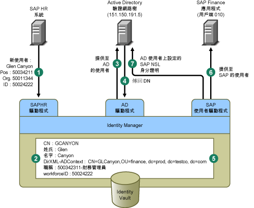 圖 4-1 所顯示的是一種典型卻又簡易的案例,其中涉及將 SecureLogin 身分證明提供給財務部門中 SAP* Finance 應用程式的新「使用者」。 之所以會使用 SAP 使用者提供,是因為它是一種需要登入參數多於需要提供給大多數應用程式之典型使用者名稱和密碼的應用程式。