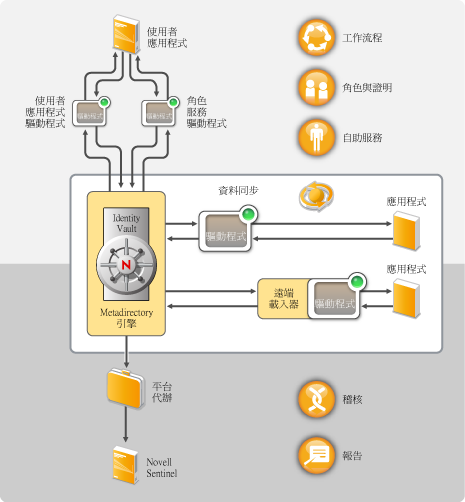 下圖顯示高階架構元件,這些元件提供節 1.0, Identity Manager 與企業流程自動化 中介紹的 Novell® Identity Manager 功能:資料同步、工作流程、角色、證明、自助服務及稽核/報告。