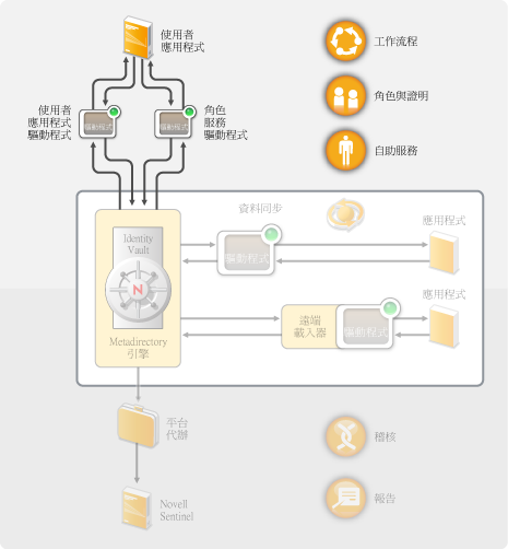 使用者應用程式驅動程式: 「使用者應用程式」驅動程式會儲存組態資訊,且只要 Identity Vault 中一有變動,就會通知「使用者應用程式」。也可以將它設為允許 Identity Vault 中的事件觸發工作流程,並向「使用者應用程式」回報工作流程的提供活動是成功或失敗,以便使用者檢視其申請的最終狀態。