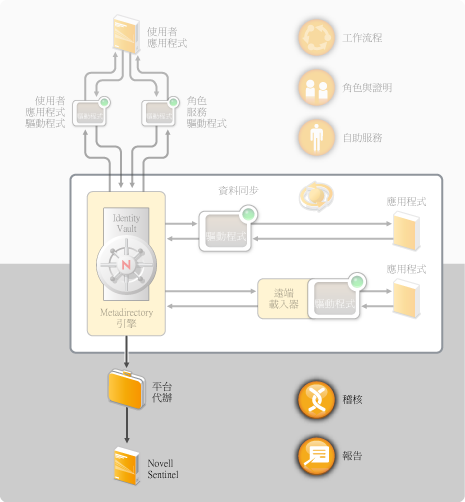 如下圖所示,稽核與報告功能是經由與 Novell Sentinel™ 整合來提供。