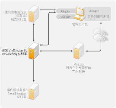 您可以在 Identity Manager 解決方案中具有一或多部 Metadirectory 伺服器,視伺服器工作量而定。Metadirectory 伺服器需要安裝 eDirectory,如圖 3-3中所示。您可以新增未在圖片中描繪的「遠端載入器」伺服器,來協助處理環境的工作量或組態。
