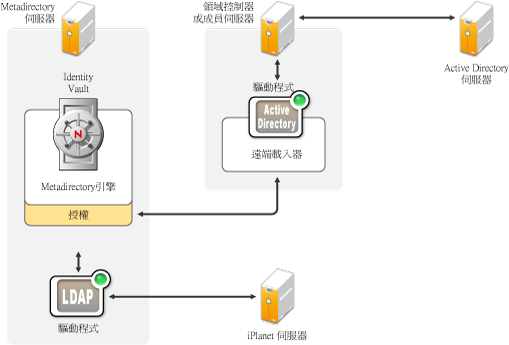 有許多不同方法可設定 Identity Manager,以讓它利用本身的所有功能。圖 4-1 展示了 Identity Manager 的基本組態。此組態透過同步化資料來佈建使用者。不管如何設定 Identity Manager,請一律從基本系統開始。